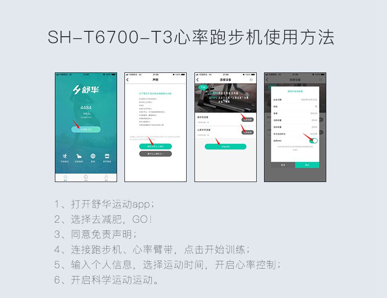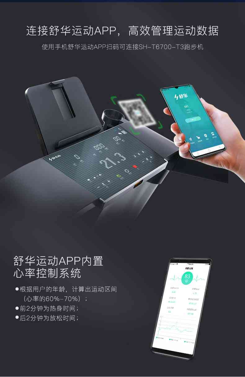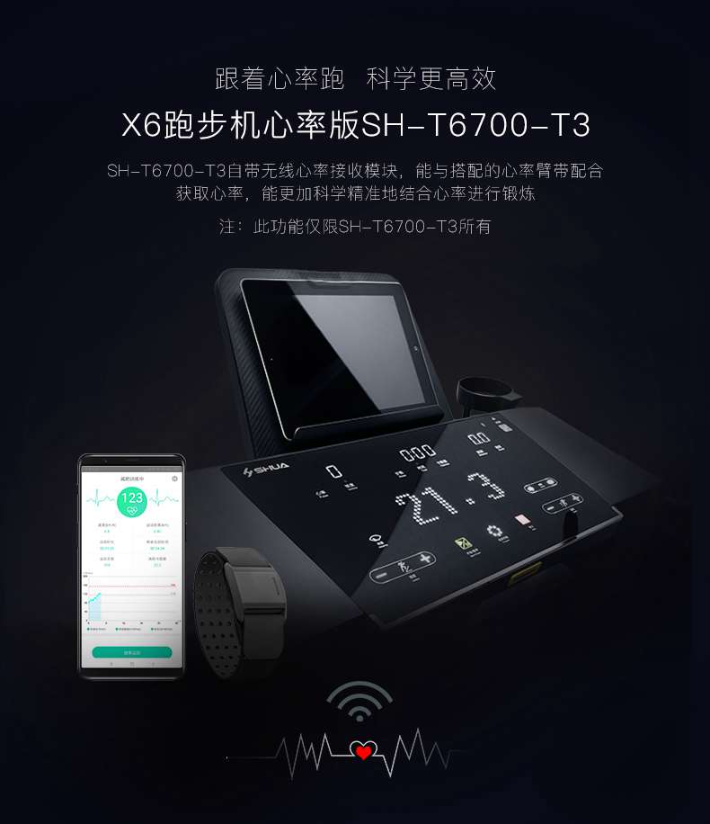 SH-T6700-T3跑步机为了帮助用户进行更加科学有效的运动,搭载leyu.乐鱼APP连接心率臂带实现心率控制,通过监测运动心率从而实现科学运动。