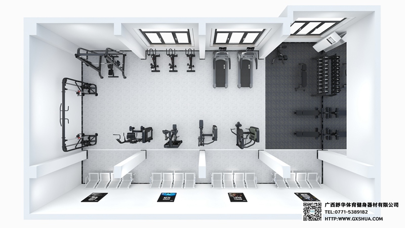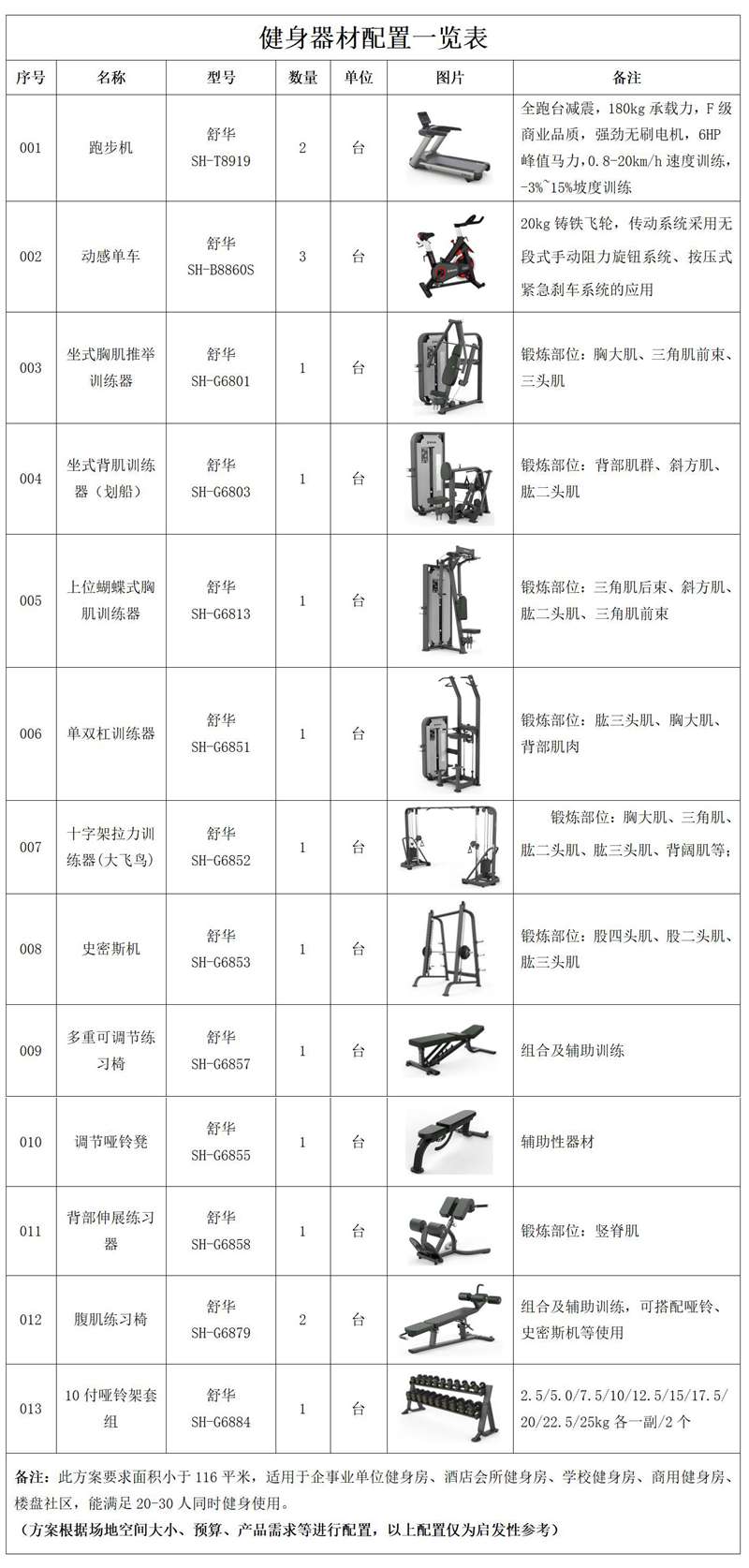 此方案要求面积小于116平米,适用于企事业单位健身房、酒店会所健身房、楼盘社区健身房,能满足10-20人同时健身使用。(方案根据场地空间大小、预算、产品需求等进行配置仅为启发性参考)