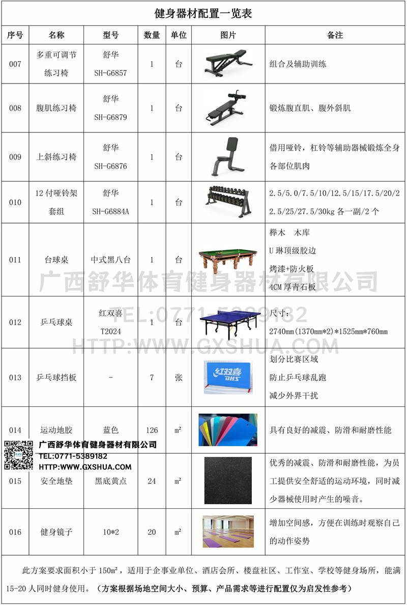 150m²企事业单位健身房根据客户需求及预算,有氧器材区域配置leyu.乐鱼跑步机、椭圆机、动感单车,多元化的有氧器材能够有效提升心肺功能;力量器械配置综合训练器,可拓展多种训练方法,提供针对性训练、多种组合等训练方式,全方位激活身体机能。自由力量区域配置哑铃套组、腹肌训练器等满足多样化训练需求,促使健身训练更丰富。单位健身房配置台球桌、乒乓球桌,为员工的业余生活增添了乐趣和选择。与传统的健身器材锻炼相比,台球、乒乓球具有更强的娱乐性和趣味性,能够吸引更多员工参与到健身活动中来,提高健身房的使用率,让员工在工作之余有更多放松身心的方式。