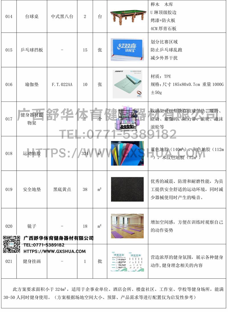 此方案要求面积小于324m²,适用于企事业单位、酒店会所、楼盘社区、工作室、学校等健身场所,能满30-50人同时健身使用。(方案根据场地空间大小、预算、产品需求等进行配置仅为启发性参考)