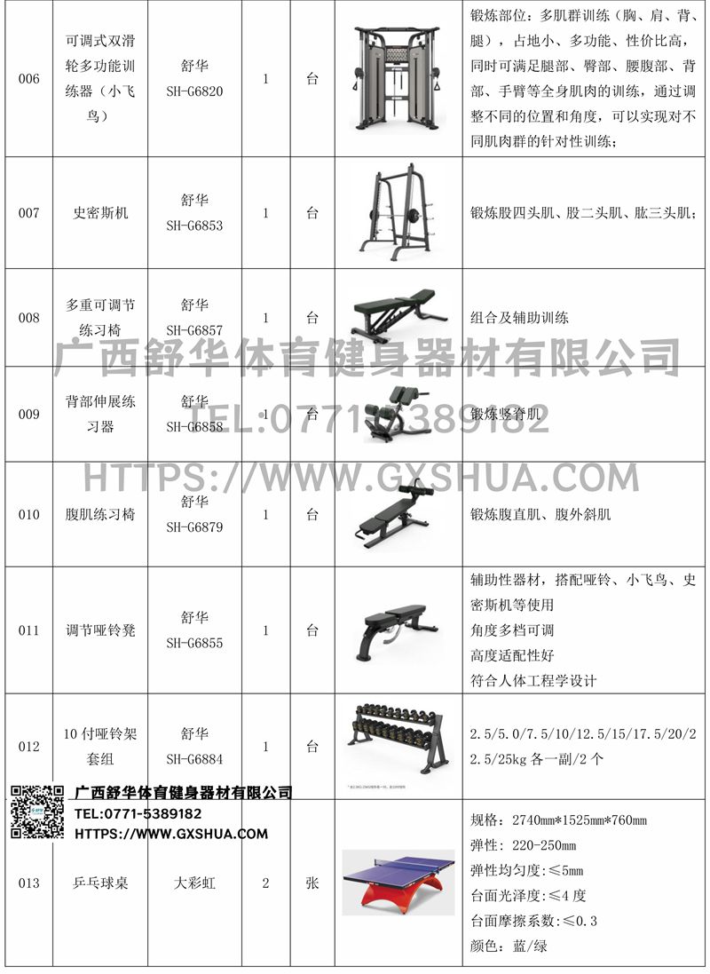 史密斯机(1台),多重可调节练习椅1台),腹肌训练器(1台),10付哑铃套组(1套),可调哑铃凳(1张),可以实现对不同肌肉群的针对性训练,满足肌肉训练需求,全方位激活身体机能。