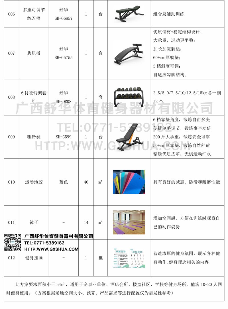此方案要求面积小于54m²,适用于企事业单位、酒店会所、楼盘社区、学校等健身场所,能满10-20人同时健身使用。(方案根据场地空间大小、预算、产品需求等进行配置仅为启发性参考)