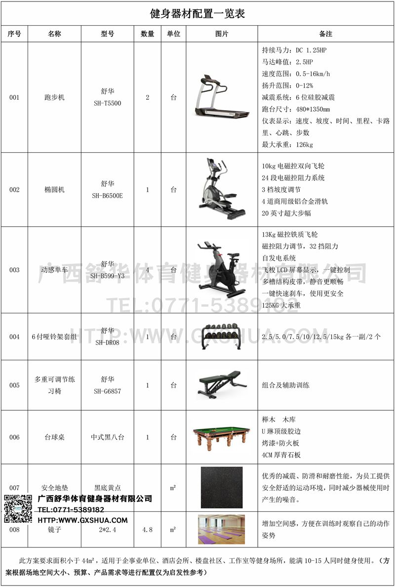 此方案要求面积小于44m²,适用于企事业单位、酒店会所、楼盘社区、工作室等健身场所,能满10-15人同时健身使用。(方案根据场地空间大小、预算、产品需求等进行配置仅为启发性参考)