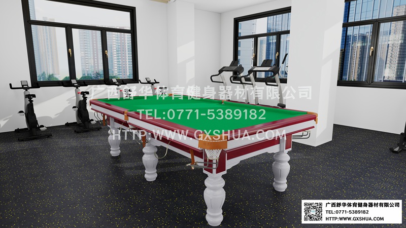 6.台球桌*1张-单位健身房配置台球桌,为员工的业余生活增添了乐趣和选择。与传统的健身器材锻炼相比,台球具有更强的娱乐性和趣味性,能够吸引更多员工参与到健身活动中来,提高健身房的使用率,让员工在工作之余有更多放松身心的方式。