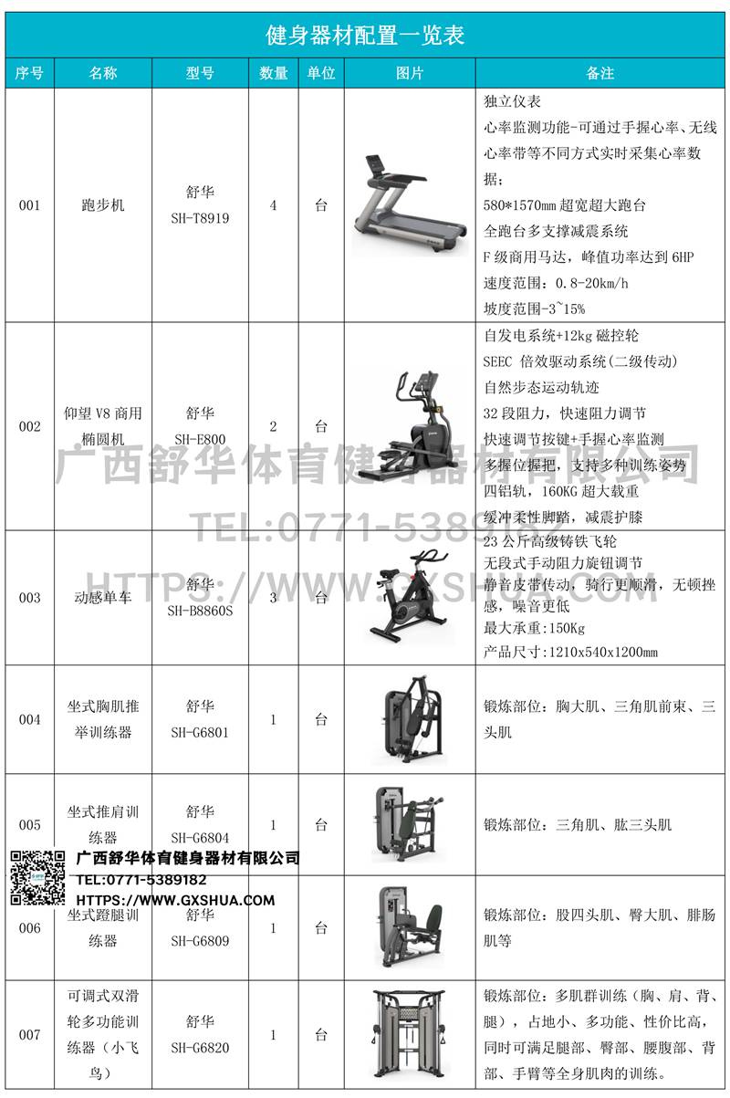 1.leyu.乐鱼V9跑步机SH-T8919*4台-独立仪表-简洁大气,全新外观设计,健康运动新选择;心率监测功能,可通过手握心率、无线心率带等不同方式实时采集心率数据;580*1570mm超宽超大跑台-跑感舒适,跑台整体安全稳定;全跑台多支撑减震平台,保证跑台超强支撑力,达到180kg支撑,满足专业健身房需求。F级商用马达-超强马达,AC 3.0HP 交流,峰值功率达到6HP,F级商用品质。速度范围达到0.8-20km/h;V9跑步机可实现跑台扬升功能,坡度范围-3~15%,满足不同的锻炼需求。
